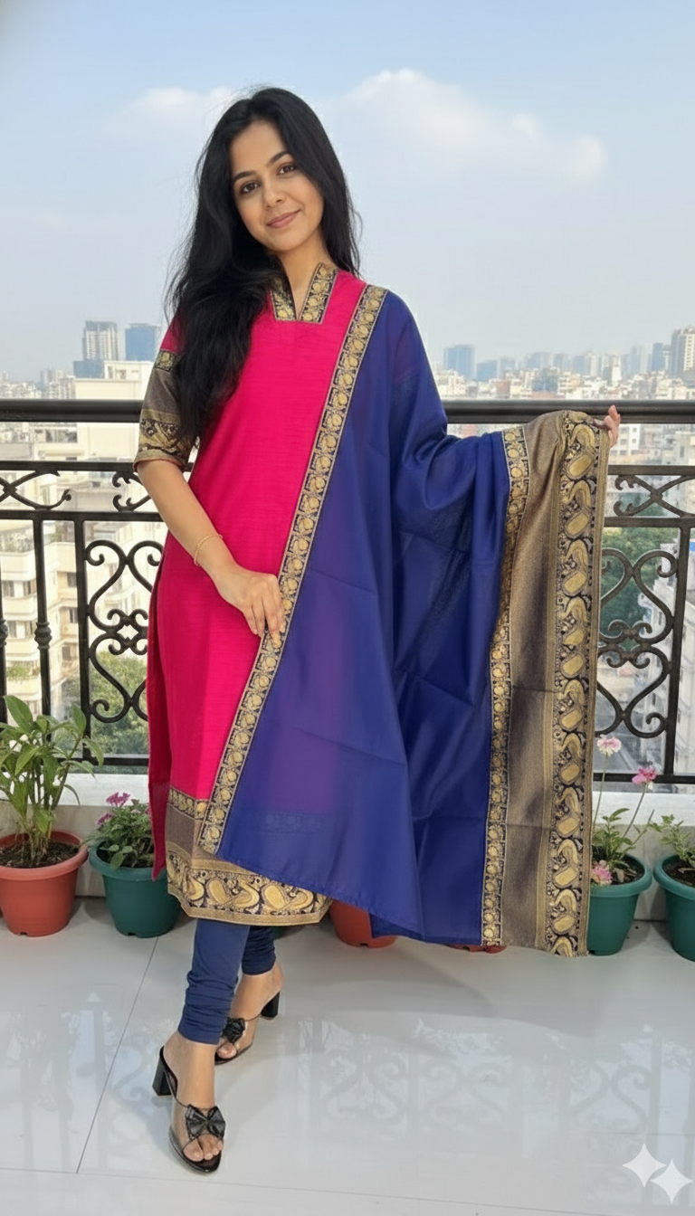 • Elegant Chanderi Cotton Straight Kurta with Contrast Dupatta