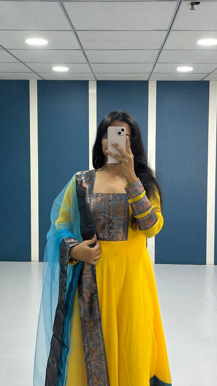 Elegant Yellow Georgette Anarkali Kurti with Blue Dupatta